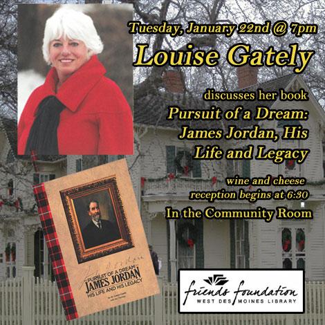 Author (Mary) Louise Gately earned a B.A. in History and Social Science and an M.S.E. in Higher Ed. Administration/Development from Drake University. She served on the board of the West Des Moines Historical Society for 25 years and is the Jordan Historian in West Des Moines. She is also a former board president of the WDM Library Board of Trustees.