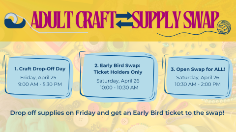 Donated craft supplies* will be accepted on Friday, April 25 from 9am-5:30 pm at the Adult Services desk. Any individual who donates craft supplies will receive a VIP ticket for Early Bird entrance the day of the swap.