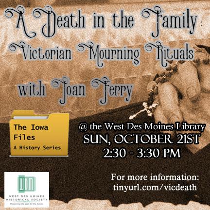 The mirrors are covered, black crepe ribbons are on the door and the ladies of the house are airing out their black dresses. There's been a death in the family, and Joan Ferry will talk about Victorian death customs, some familiar, some not.