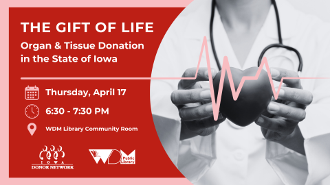 Are you curious about what organ/tissue donation involves but aren’t sure where to find the best information? Do you ever wonder about the impact that a donation can make on an individual? April is Donate Life month, so we welcome you to please join us for this presentation from the Iowa Donor Network. We will cover why you might consider becoming an organ and tissue donor, the legalities of signing up to be a donor, how to register, and the impact that organ and tissue donation has across the state of Iowa.